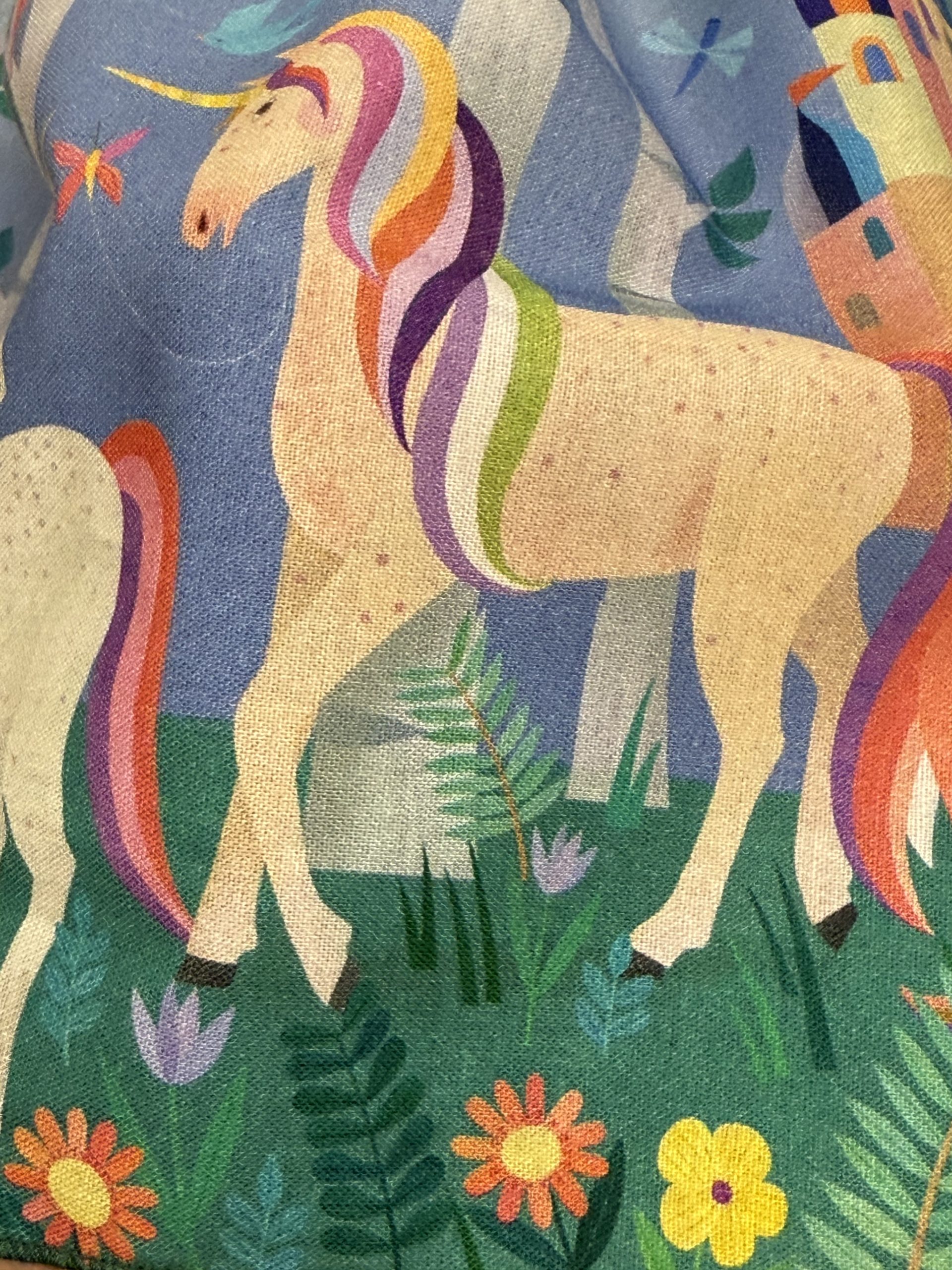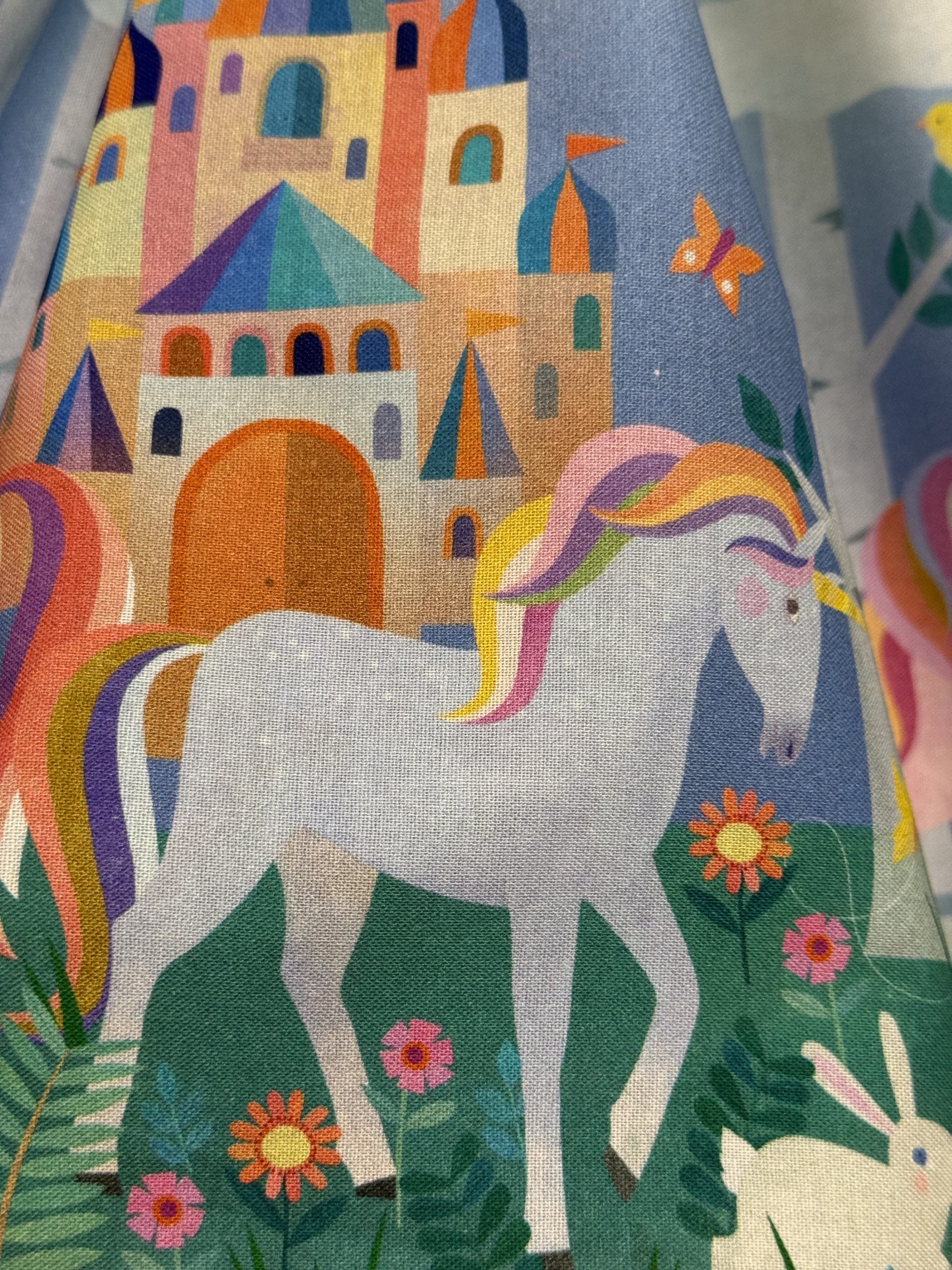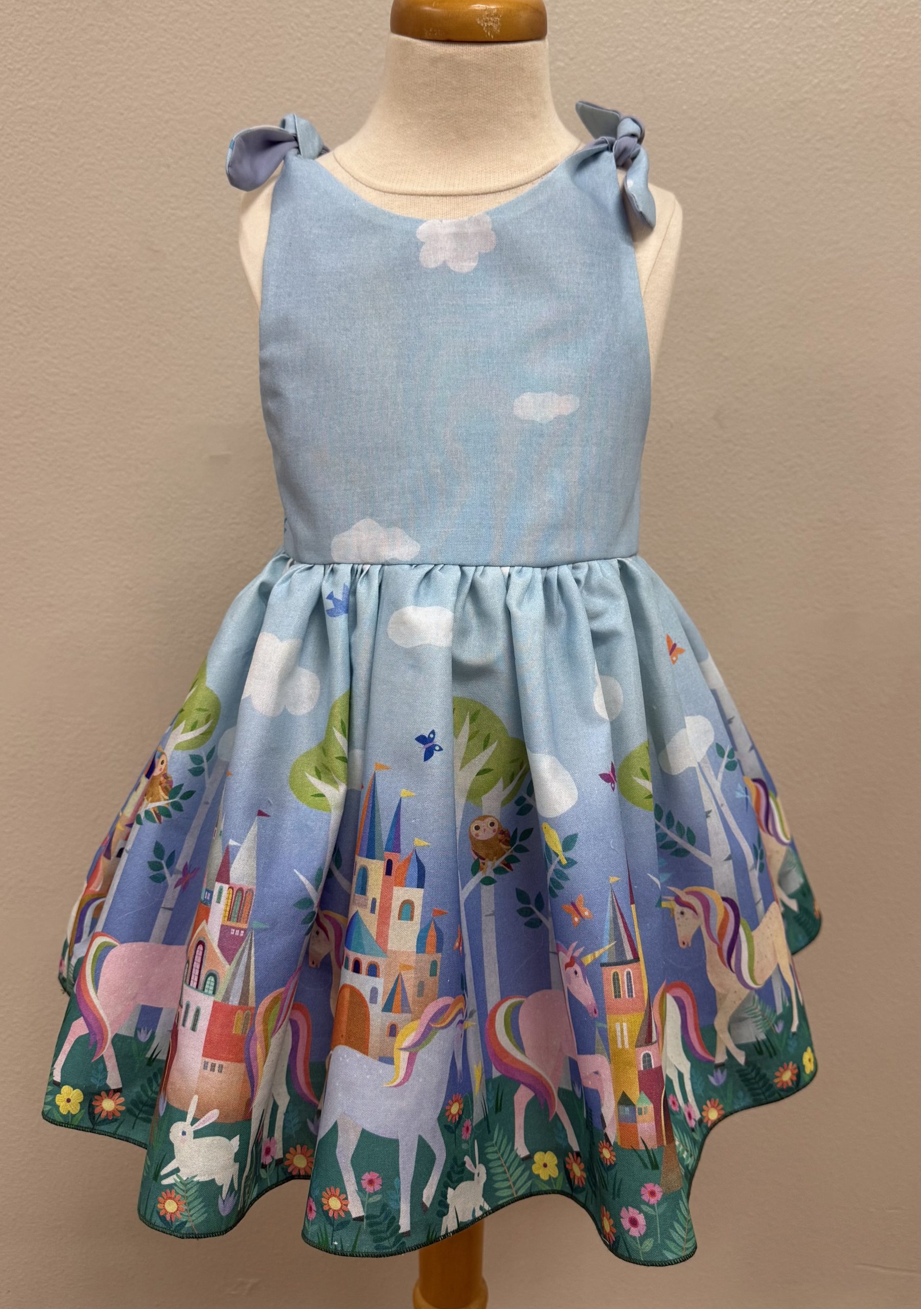 Any little girl would love to have this dress-unicorns and castles! Pair it with a blouse or T-shirt and she will be ready for the cooler temperatures. The bodice is fully lined and ties at the shoulder. Next year, as she gets taller, loosen the ties. Need a different size? This pattern comes in sizes 1-6 and can be made to order at no extra charge. You can call or text at 914-261-0580 for more details. Made from 100% cotton. Machine wash and dry.